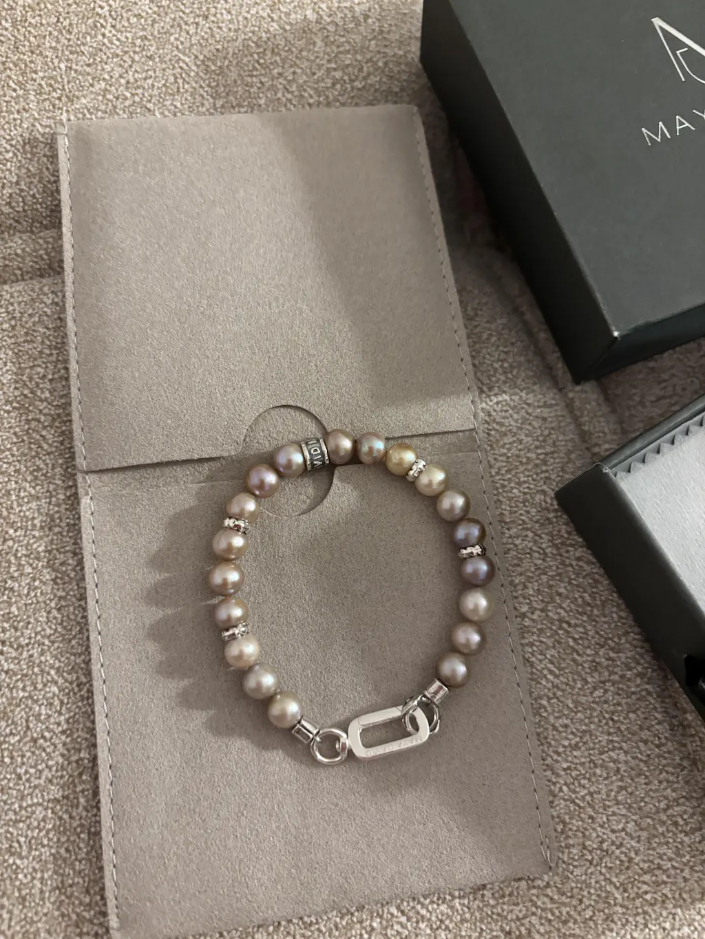 Handcrafted with 8mm freshwater pearls in soft mauve tones, the Muse Pearl Bracelet brings a smooth, modern feel to a timeless material. Polished silver accents and a Maya David bead add subtle shine, while the swivel push clasp gives the piece a clean, understated finish.