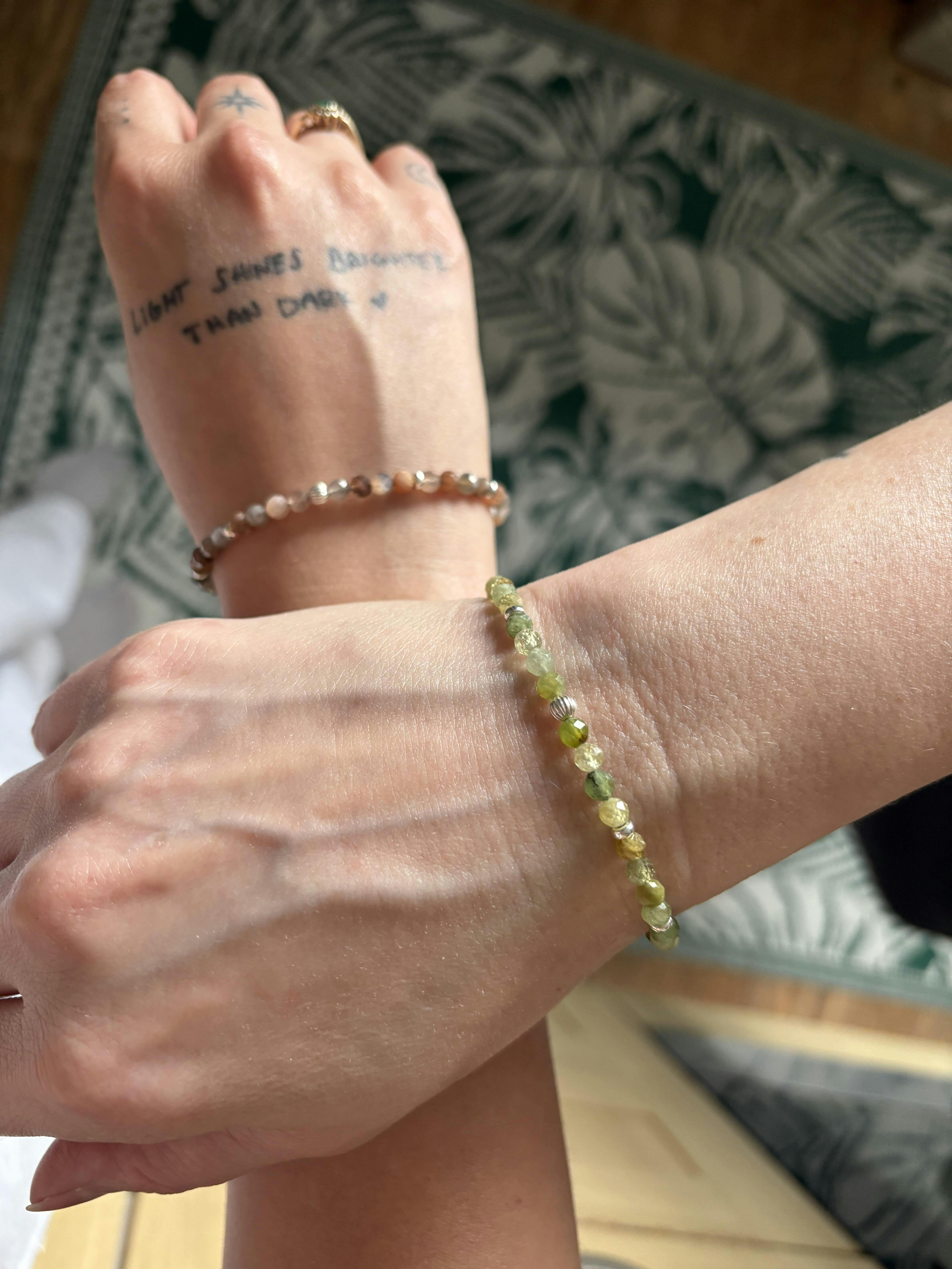 Handcrafted with 4mm faceted Jade in soft, earthy greens, the Verdant Bracelet brings balance and understated elegance to your stack. Accented with polished sterling silver, including a central corrugated bead and a secure swivel lobster clasp, this piece offers versatility, meaning, and modern style in one clean silhouette. Wear it solo for a grounded statement or layered for a textural mix.